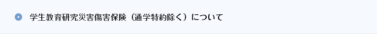 「学生教育研究災害傷害保険」とは、大学における学生の教育研究中の災害事故についての全国的な補償救済制度としての傷害保険であり、本学では昭和58 年度入学生より全員加入しています(通学特約除く)。これは、正課授業中、大学主催行事中、課外活動中ならびにキャンパス内での休憩時等における不慮の災害事故によって身体に被った傷害に対し同制度が適用されるものです。もし、該当する事故により負傷した場合は、必ず学生課へ届け出てください。