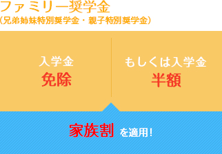 兄弟姉妹特別奨学金では、本学に同時に在籍する者のうち下位に入学した学生の入学金を免除。また、本学を卒業した学生の兄弟姉妹が入学した場合には入学金が半額になります。親子特別奨学金では、本学に同時に在籍する親子のうち下位に入学した学生の入学金免除。また、本学を卒業した者の子どもが入学した場合には入学金が半額になります。